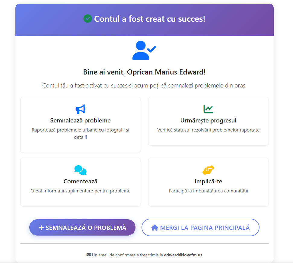 📌 Validarea emailului nu este obligatorie, dar este recomandată pentru a primi notificări despre statusul sesizărilor tale.