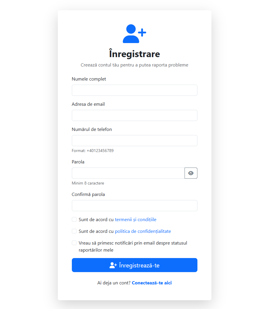 Primul pas pentru a putea raporta o problemă este să îți creezi un cont.